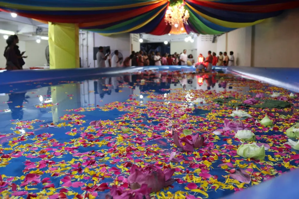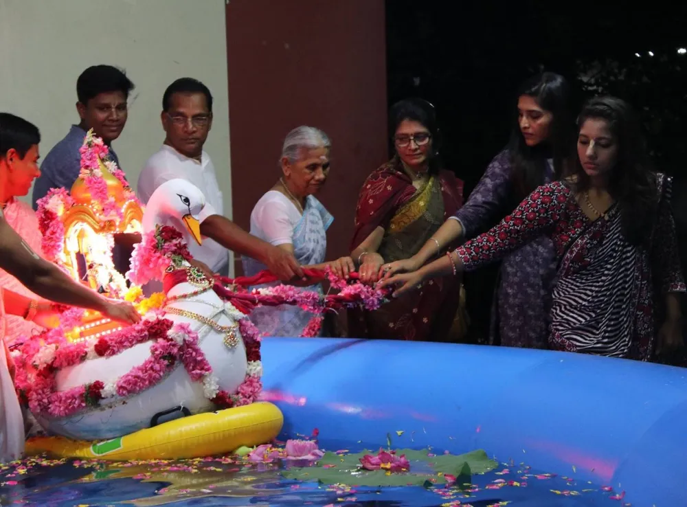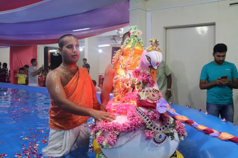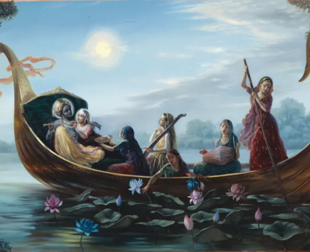 A beautiful swan-shaped boat will host the utsava deities of Their Lordships Śrī Śrī Rādhā Madana-mohana in a beautifully-decorated, big pool of water. Everyone will get a chance to pull Their Lordships on the boat around the pool.